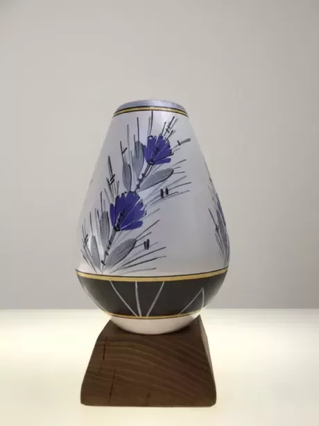 Deze vaas uit de jaren vijftig heeft het handgeschilderde Cora-decor, gekenmerkt door blauwpaarse korenbloemen. Deze vaas heeft geen groene zijkant. De vaas is aan de onderzijde genummerd met nr 1058.